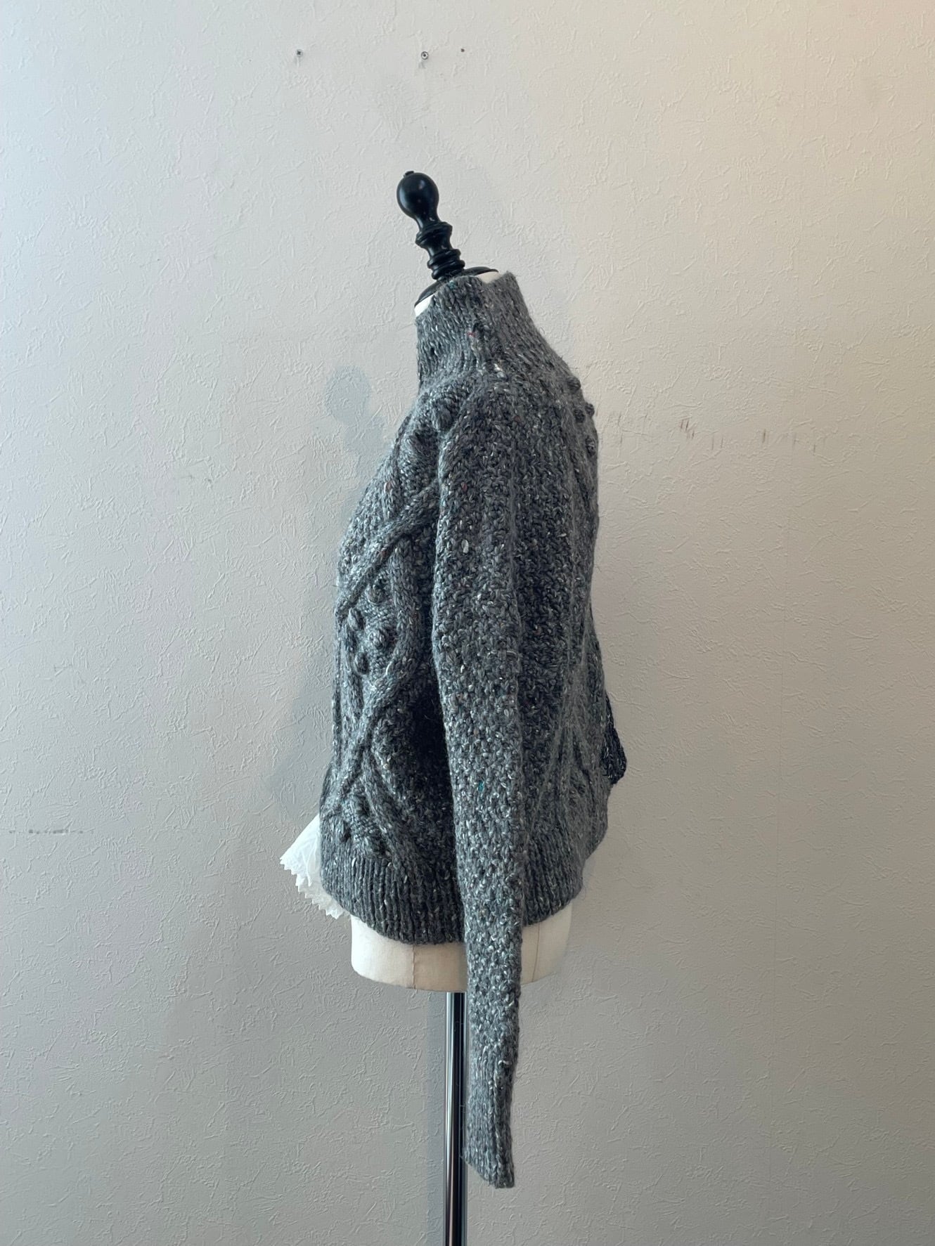 手編みのニットです。ニットは素材の特性上斜行します。1着づつ寸法に差が出ます。御了承下さい。糸の特性から織ムラや、ネップ、大きめのスラブ、ふし等が入る場合があります。繊細な生地を使用していますのでお取扱いにご注意ください。
