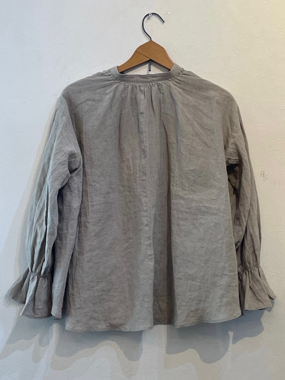 メロフォンブラウス size 1 着丈 60 肩幅 49.6 袖丈 48.5 *素材の特性上、ネップやシワ、ヨレがあることがあります。 *素材の特性上、着用やクリーニングなどによる収縮や白化があります。 2020年秋冬につくった古い笛をイメージしたかたちにより派生させたアイテム。 袖にひだを作りたくし上げられる仕様にしたもの。軽く自然なシワ感を残したリネンを使用。