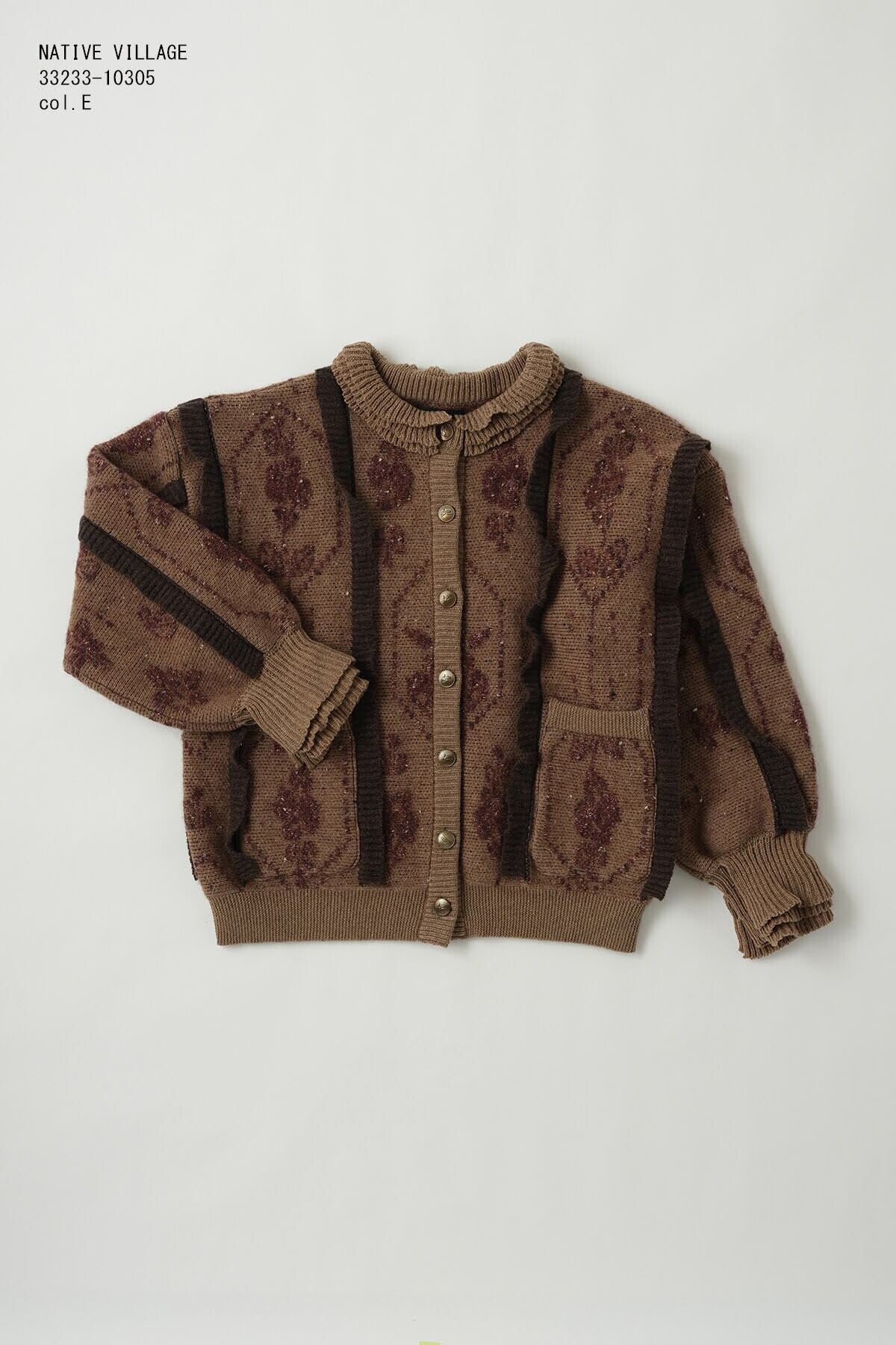 ジャガード編のカーディガンは、柄を編みながらそのままフリルも繋げて編むと言う職人技の一品です。ニットは素材の特性上斜行します。1着づづ寸法に差がでます。御了承下さい。